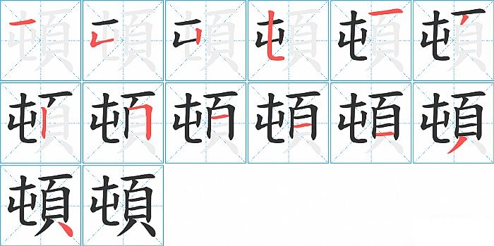頓是左右结构,頓的部首是“頁”,部外笔画4画,总笔画13画,頓的笔画顺序是“横、竖折/竖弯、竖、竖提、横、撇、竖、横折、横、横、横、撇、点”。看看“頓”字什么意思 >>