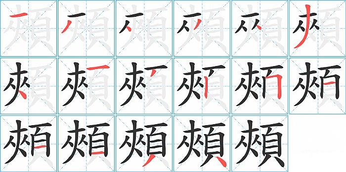 頰是左右结构,頰的部首是“頁”,部外笔画7画,总笔画16画,頰的笔画顺序是“横、撇、点、撇、点、撇、点、横、撇、竖、横折、横、横、横、撇、点”。看看“頰”字什么意思 >>