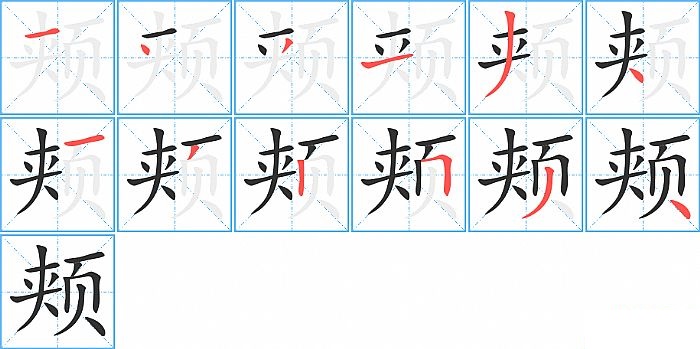 颊是左右结构,颊的部首是“页”,部外笔画6画,总笔画12画,颊的笔画顺序是“横、点、撇、横、撇、点、横、撇、竖、横折、撇、点”。看看“颊”字什么意思 >>