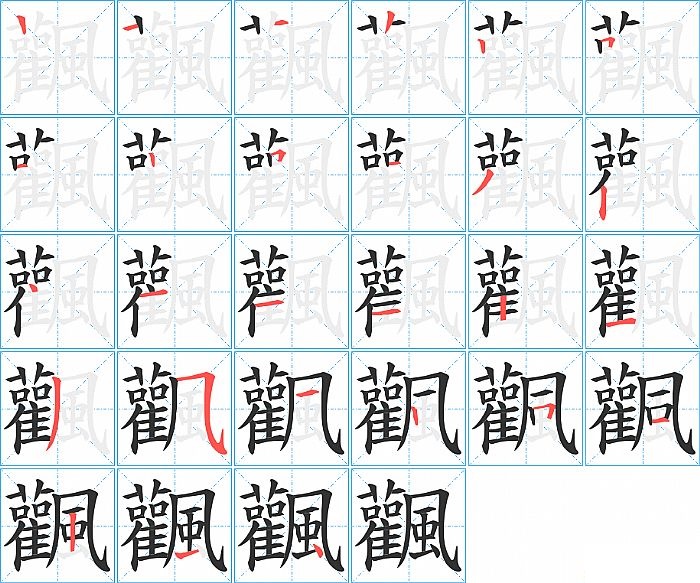 飌是左右结构,飌的部首是“風”,部外笔画17画,总笔画26画,飌的笔画顺序是“横、竖、竖、竖、横折、横、竖、横折、横、撇、竖、点、横、横、横、竖、横、撇、横折弯钩/横斜钩、撇、竖、横折、横、竖、横、点”。看看“飌”字什么意思 >>