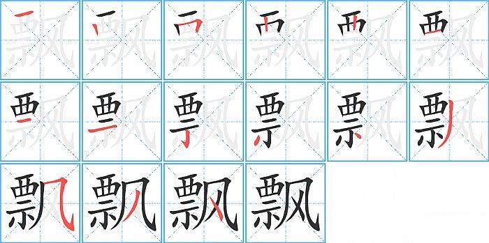 飘是左右结构,飘的部首是“风”,部外笔画11画,总笔画15画,飘的笔画顺序是“横、竖、横折、竖、竖、横、横、横、竖钩、撇、点、撇、横折弯钩/横斜钩、撇、点”。看看“飘”字什么意思 >>