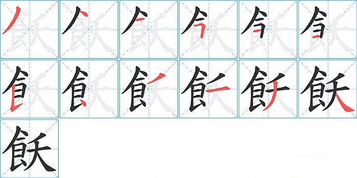 飫是左右结构,飫的部首是“飠”,部外笔画4画,总笔画12画,飫的笔画顺序是“撇、点、点、横折、横、横、竖提、点、撇、横、撇、捺”。看看“飫”字什么意思 >>