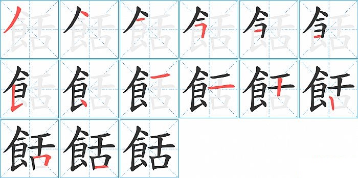 餂是左右结构,餂的部首是“飠”,部外笔画6画,总笔画14画,餂的笔画顺序是“撇、点、点、横折、横、横、竖提、点、撇、横、竖、竖、横折、横”。看看“餂”字什么意思 >>