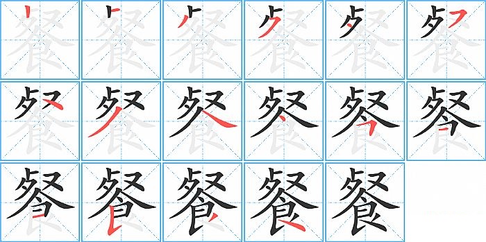 餐是上下结构,餐的部首是“飠”,部外笔画8画,总笔画16画,餐的笔画顺序是“竖、横、撇、横撇/横钩、点、横撇/横钩、点、撇、捺、点、横折、横、横、竖提、撇、点”。看看“餐”字什么意思 >>