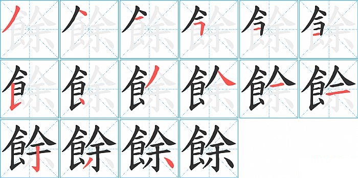 餘是左右结构,餘的部首是“飠”,部外笔画7画,总笔画15画,餘的笔画顺序是“撇、点、点、横折、横、横、竖提、点、撇、捺、横、横、竖钩、撇、点”。看看“餘”字什么意思 >>