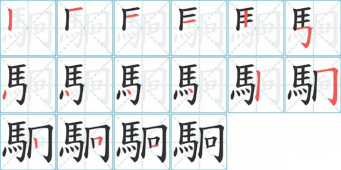 駉是左右结构,駉的部首是“馬”,部外笔画5画,总笔画15画,駉的笔画顺序是“横、竖、横、横、竖、横折钩、点、点、点、点、竖、横折钩、竖、横折、横”。看看“駉”字什么意思 >>
