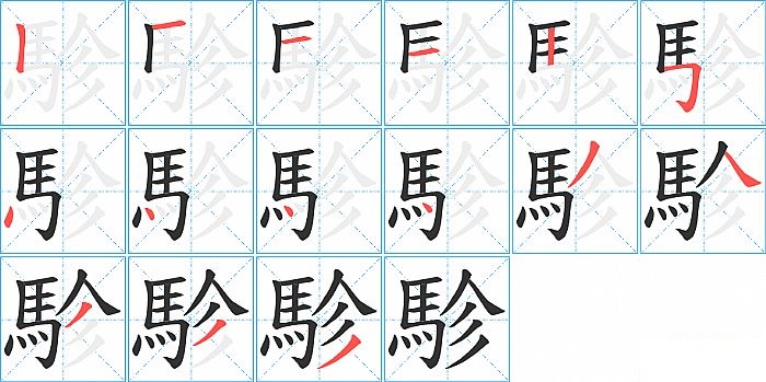 駗是左右结构,駗的部首是“馬”,部外笔画5画,总笔画15画,駗的笔画顺序是“横、竖、横、横、竖、横折钩、点、点、点、点、撇、捺、撇、撇、撇”。看看“駗”字什么意思 >>