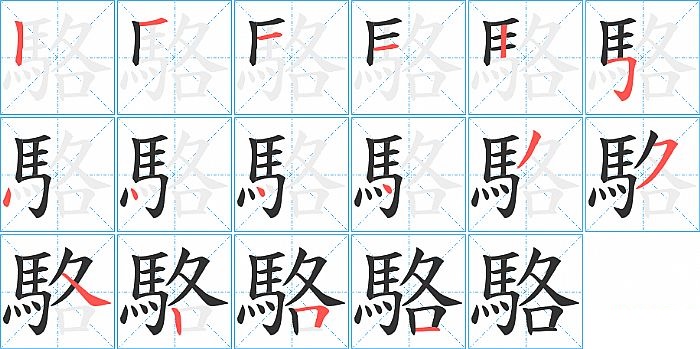 駱是左右结构,駱的部首是“馬”,部外笔画6画,总笔画16画,駱的笔画顺序是“横、竖、横、横、竖、横折钩、点、点、点、点、撇、横撇/横钩、捺、竖、横折、横”。看看“駱”字什么意思 >>