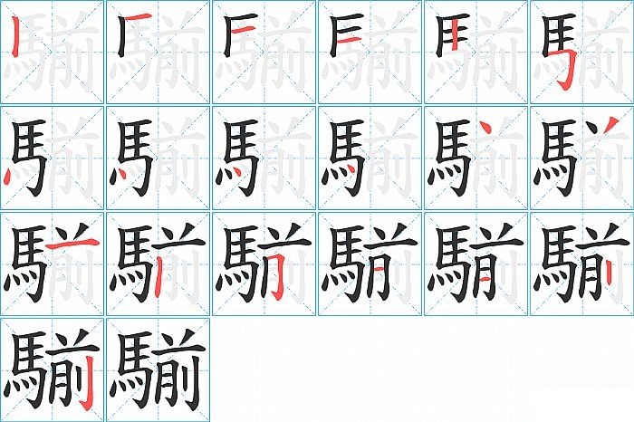 騚是左右结构,騚的部首是“馬”,部外笔画9画,总笔画19画,騚的笔画顺序是“横、竖、横、横、竖、横折钩、点、点、点、点、点、撇、横、竖、横折钩、横、横、竖、竖钩”。看看“騚”字什么意思 >>