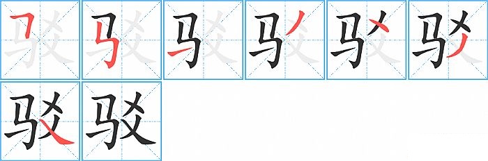 驳是左右结构,驳的部首是“马”,部外笔画4画,总笔画7画,驳的笔画顺序是“横折、竖折折钩、提、撇、点、撇、捺”。