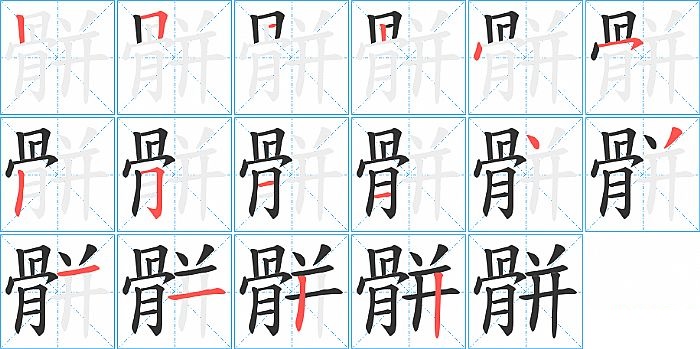 骿是左右结构,骿的部首是“骨”,部外笔画6画,总笔画15画,骿的笔画顺序是“竖、横折、横折、点、横撇/横钩、竖、横折钩、横、横、点、撇、横、横、撇、竖”。看看“骿”字什么意思 >>