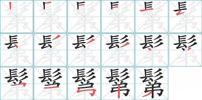 鬀是上下结构,鬀的部首是“髟”,部外笔画7画,总笔画17画,鬀的笔画顺序是“横、竖、横、横、横、撇折、点、撇、撇、撇、点、撇、横折、横、竖折折钩、竖、撇”。看看“鬀”字什么意思 >>