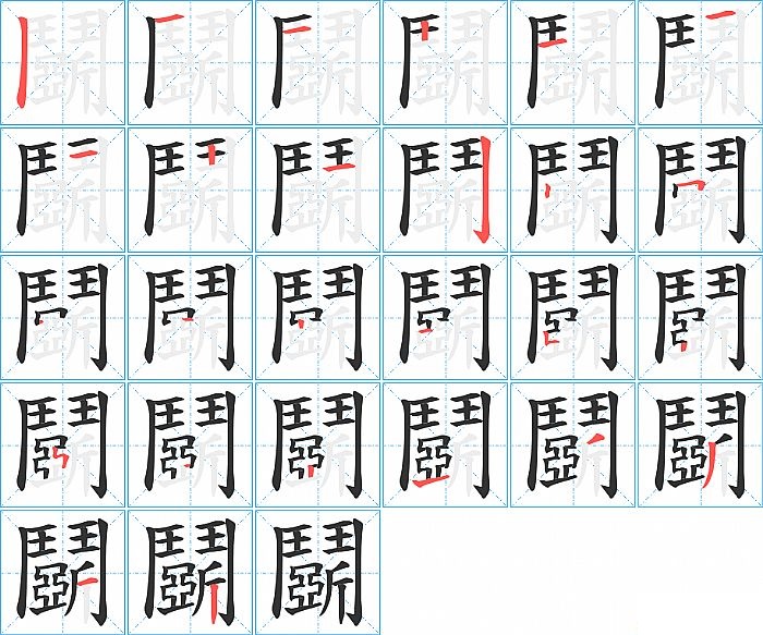 鬬是上包围结构,鬬的部首是“鬥”,部外笔画14画,总笔画24画,鬬的笔画顺序是“横、横、竖、横、竖、横、横、竖、横、竖钩、横、竖折撇/竖折折、横、竖折撇/竖折折、竖、横、竖折撇/竖折折、横、竖、提、撇、撇、横、竖”。看看“鬬”字什么意思 >>