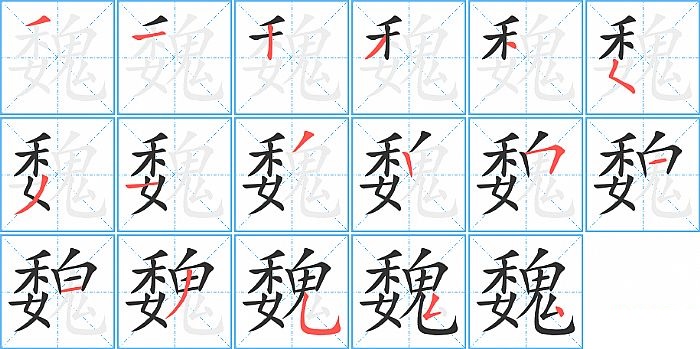 魏是左右结构,魏的部首是“鬼”,部外笔画8画,总笔画17画,魏的笔画顺序是“撇、横、竖、撇、点、撇点、撇、横、撇、竖、横折、横、横、撇、竖弯钩、撇折、点”。看看“魏”字什么意思 >>