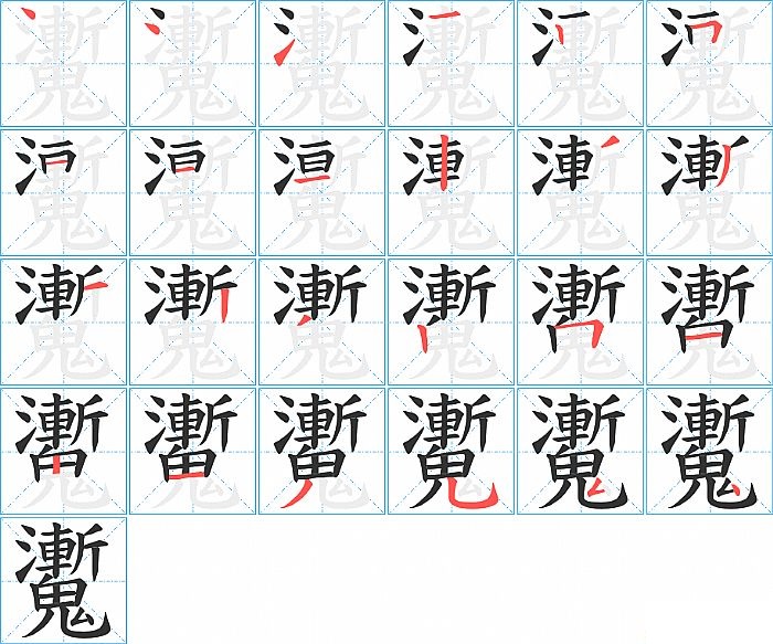 点、点、提、横、竖、横折、横、横、横、竖、撇、撇、横、竖、撇、竖、横折、横、横、撇、竖弯钩、撇折、点