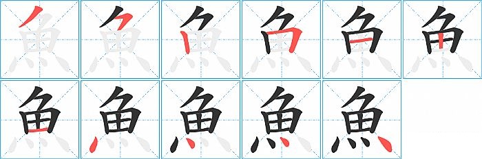 魚是上中下结构,魚的部首是“魚”,部外笔画0画,总笔画11画,魚的笔画顺序是“撇、横撇/横钩、竖、横折、横、竖、横、点、点、点、点”。看看“魚”字什么意思 >>