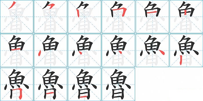 魯是上下结构,魯的部首是“魚”,部外笔画4画,总笔画15画,魯的笔画顺序是“撇、横撇/横钩、竖、横折、横、竖、横、点、点、点、点、竖、横折、横、横”。看看“魯”字什么意思 >>