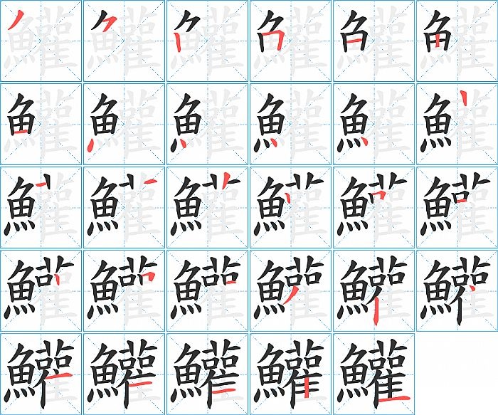 鱹是左右结构,鱹的部首是“魚”,部外笔画17画,总笔画28画,鱹的笔画顺序是“撇、横撇/横钩、竖、横折、横、竖、横、点、点、点、点、横、竖、竖、竖、横折、横、竖、横折、横、撇、竖、点、横、横、横、竖、横”。看看“鱹”字什么意思 >>