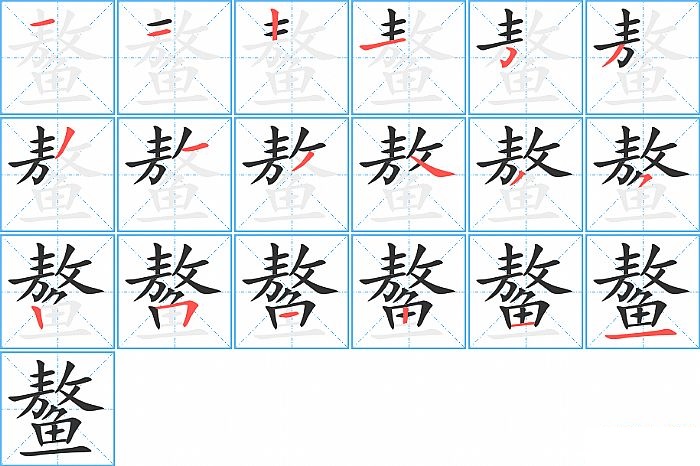 鳌是上下结构,鳌的部首是“鱼”,部外笔画10画,总笔画18画,鳌的笔画顺序是“横、横、竖、横、横折钩、撇、撇、横、撇、捺、撇、横撇/横钩、竖、横折、横、竖、横、横”。看看“鳌”字什么意思 >>