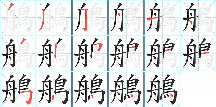 鵃是左右结构,鵃的部首是“鳥”,部外笔画6画,总笔画17画,鵃的笔画顺序是“撇、撇、横折钩、点、横、点、撇、竖、横折、横、横、横、横折钩、点、点、点、点”。看看“鵃”字什么意思 >>