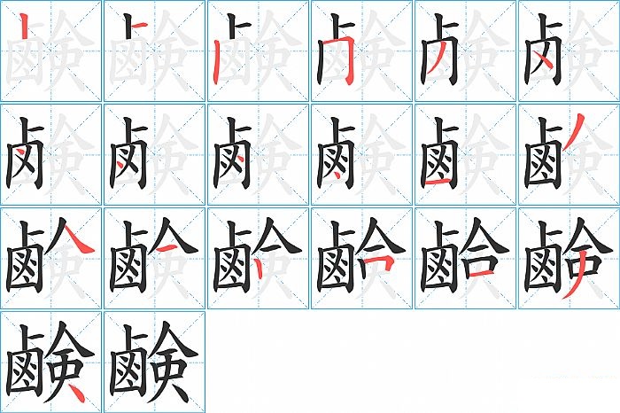 鹸是左右结构,鹸的部首是“鹵”,部外笔画8画,总笔画19画,鹸的笔画顺序是“竖、横、竖、横折、撇、点、点、点、点、点、横、撇、捺、横、竖、横折、横、撇、捺”。看看“鹸”字什么意思 >>