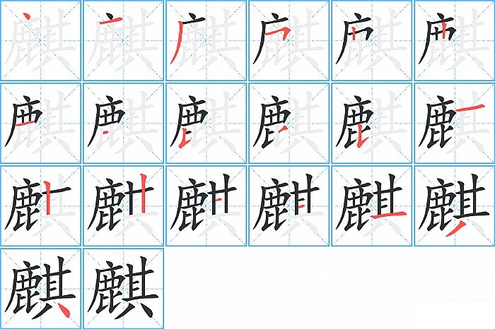 麒是左右结构,麒的部首是“鹿”,部外笔画8画,总笔画19画,麒的笔画顺序是“点、横、撇、横折、竖、竖、横、横、竖提、横、竖提、横、竖、竖、横、横、横、撇、点”。看看“麒”字什么意思 >>