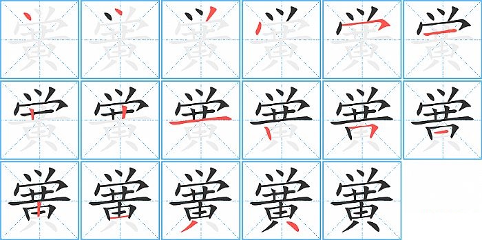 黉是上中下结构,黉的部首是“黄”,部外笔画5画,总笔画16画,黉的笔画顺序是“点、点、撇、点、横撇/横钩、横、竖、竖、横、竖、横折、横、竖、横、撇、点”。看看“黉”字什么意思 >>