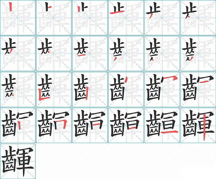齳是左右结构,齳的部首是“齒”,部外笔画9画,总笔画24画,齳的笔画顺序是“竖、横、竖、横、撇、点、撇、点、横、撇、点、撇、点、竖折/竖弯、竖、点、横撇/横钩、横、竖、横折、横、横、横、竖”。看看“齳”字什么意思 >>