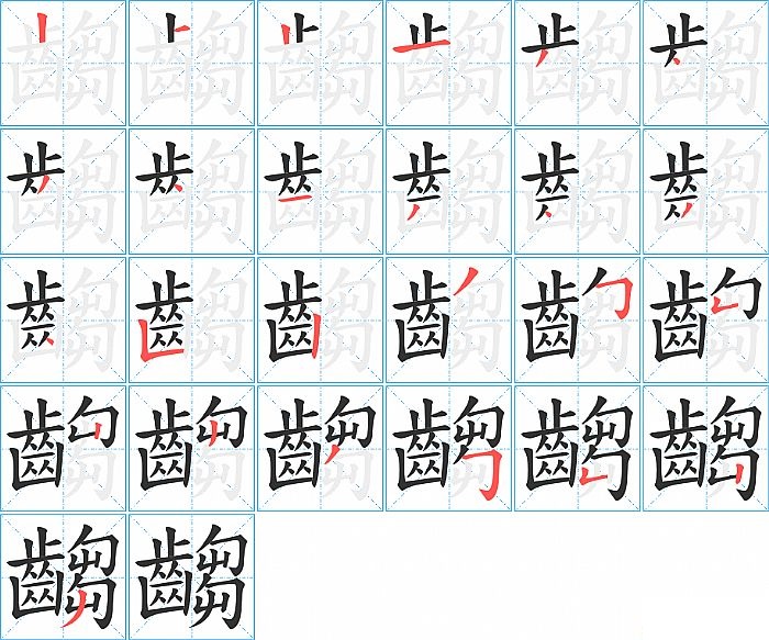 齺是左右结构,齺的部首是“齒”,部外笔画10画,总笔画25画,齺的笔画顺序是“竖、横、竖、横、撇、点、撇、点、横、撇、点、撇、点、竖折/竖弯、竖、撇、横折钩、竖折/竖弯、竖、撇、撇、横折钩、竖折/竖弯、竖、撇”。看看“齺”字什么意思 >>